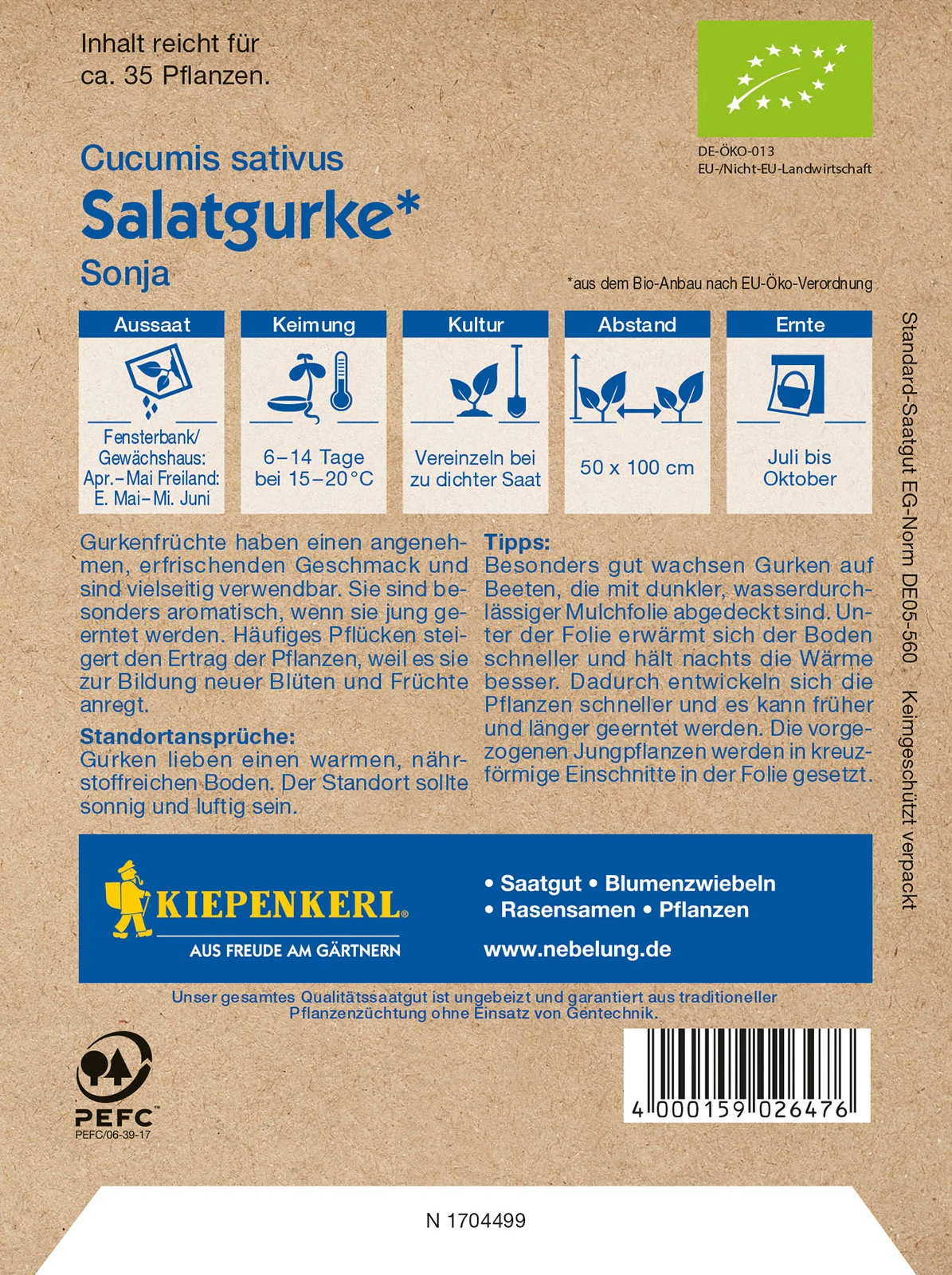 Robuste, gesunde Freiland- und Kastengurke mit bitterfreien ca. 35 cm langen, dunkelgrünen Früchten. Vielseitig verwendtbare Salatgurke. Gemischtblühend.