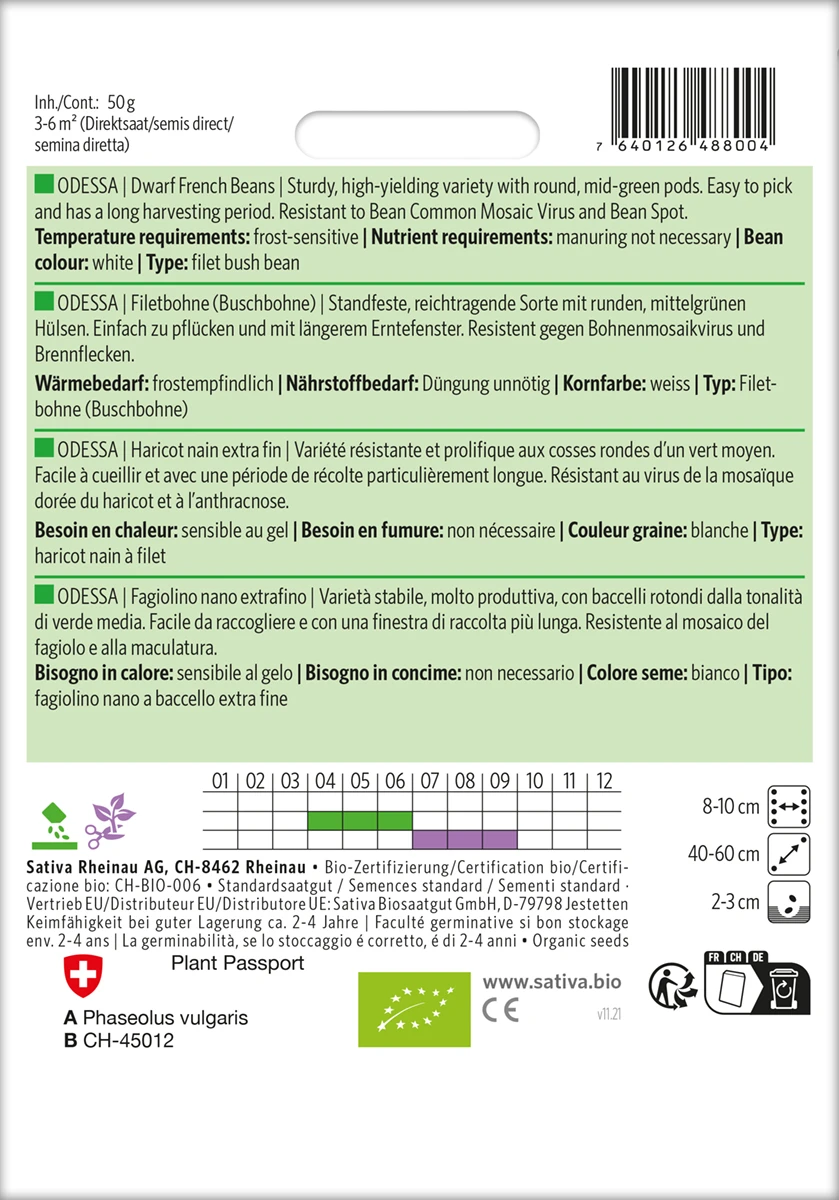 Standfeste, reichtragende Sorte mit runden, mittelgrünen Hülsen. Einfach zu pflücken und mit längerem Erntefenster. Resistent gegen Bohnenmosaikvirus und Brennflecken.