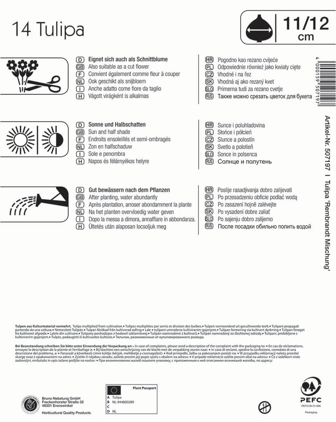 Das Mega-Pack „Rembrandt-Tulpen Mischung“ enthält insgesamt 14 Blumenzwiebeln, aus denen formschöne und farbenfrohe Rembrandt-Tulpen hervorgehen. Sie blühen im April und Mai in Weiß, Gelb, Rot, Pink und Purpur, wobei die Flammung in den Blütenblättern besonders hervorsticht und für Aufsehen sorgt. Die winterharten und mehrjährigen Tulpen werden ca. 50 cm hoch und fühlen sich in sonnigen oder halbschattigen Lagen besonders wohl. Sie können nicht nur in Beete, sondern auch Pflanzgefäße wie Kübel und Kästen gepflanzt werden. Darüber hinaus eignen sie sich auch hervorragend für den Vasenschnitt.